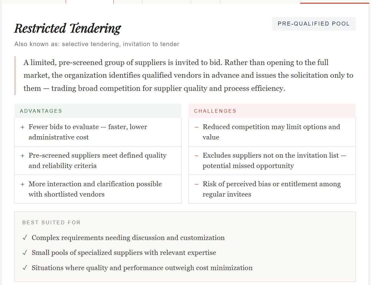 Restricted tendering is a sourcing method that involves limiting the number of suppliers who can bid for a contract. It is also known as selective tendering or invitation to tender.