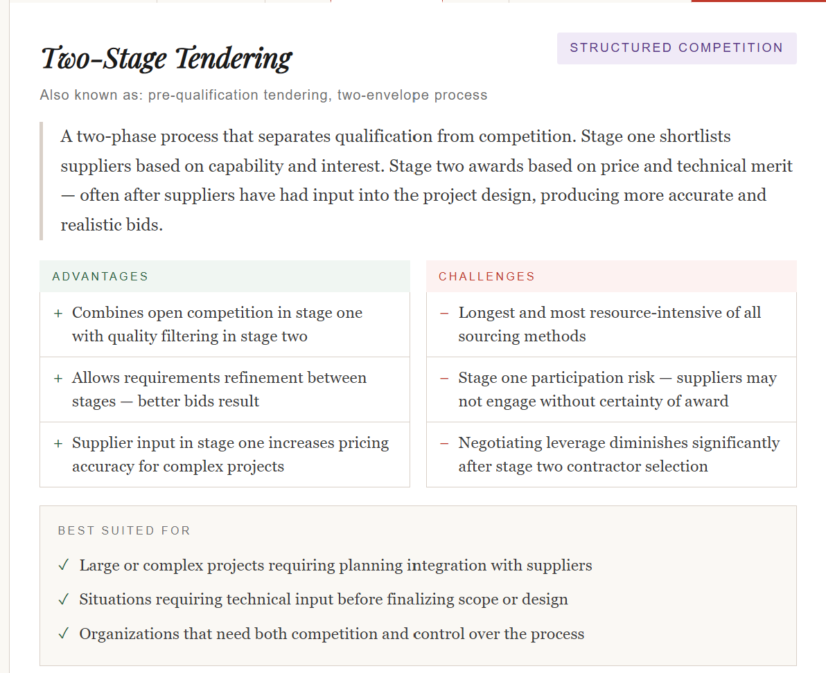 Two-stage tendering is a sourcing method that involves two rounds of bidding: