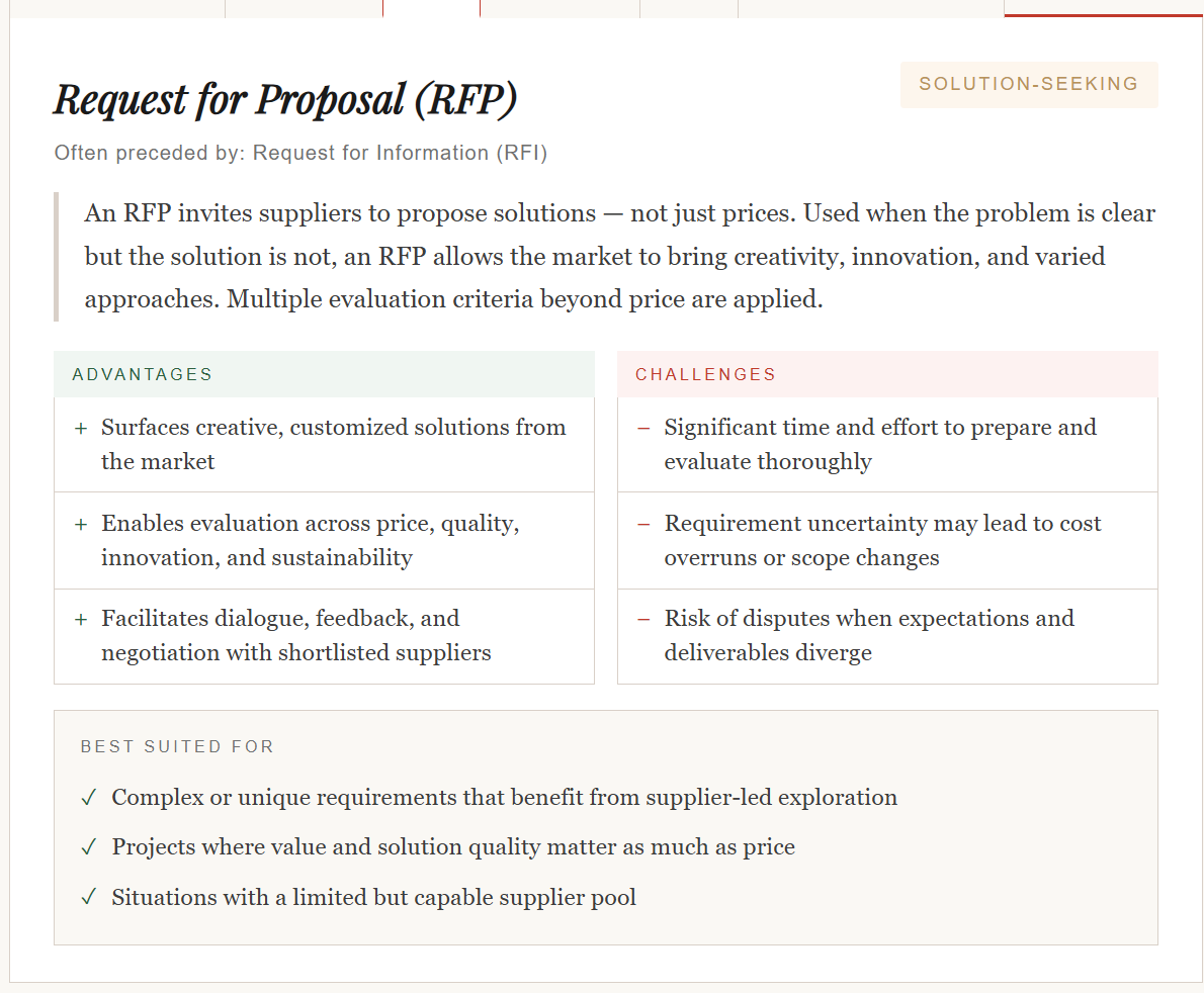 - It allows suppliers to propose creative and customized solutions that meet your specific needs and challenges.