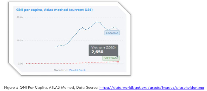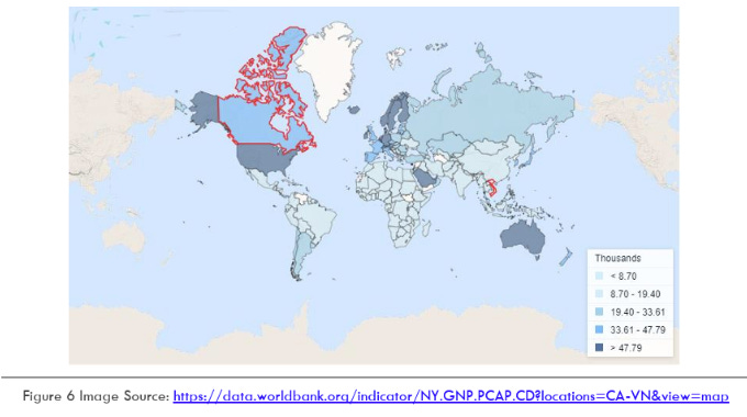 Figure 6. Image GNI per capita, Atlas method (current US$) – Canada, Viet NamData from the World Bank national accounts data, and OECD National Accounts data files. CC licence: (https://data.worldbank.org/indicator/NY.GNP.PCAP.CD?locations=CA-VN&view=map/)