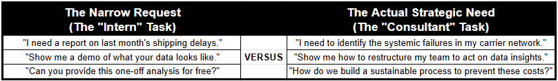 Despite our experience in high-stakes supply chain operations, important qualifications were sidelined. The buyer had no set criteria for the final deliverable, yet dismissive of any advice that didn’t involve immediately producing a demonstrative report—a report that, frankly, an intern could generate in seconds using an AI tool or spreadsheet template.